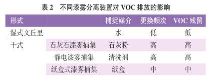 無論選用哪種形式的漆霧分離裝置,最終都將產生漆霧捕捉媒介與過噴漆霧的混合物,假設該混合物在收集后可以做到密閉保存、運輸,那么最終混合物內的VOC含量就是漆霧分離裝置對噴漆系統的VOCs減量。不同漆霧分離裝置對VOCs排放的影響見表2。