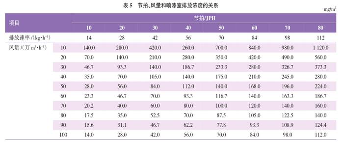 我們繼續使用表3和表4得出的結論,假設采用2C1B工藝后單車VOC排放量為2.8 kg/h,而噴漆室排風占總量的一半,達到單車1.4 kg/h。配合產能信息及噴漆室排風量,噴漆室排放濃度與節拍、風量的關系見表5。