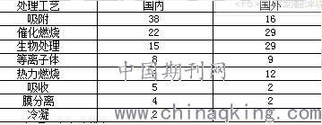 印刷有機廢氣治理應用最廣泛的技術包括吸附法、熱力氧化、光催化氧化、生物法等[2],單一的治理技術存在不同的缺陷,比如:活性炭吸附更換周期短、不耐濕度和高溫(低于120 ℃脫附),產生大量危廢;蓄熱式熱力氧化(RTO)設備投資成本高,運行能耗大,無需輔助燃料廢氣濃度>2 000mg/m3;光催化對濃度大于0.03%的有機廢氣無法實現穩定達標排放。為降低治理成本,提高適用范圍,末端治理重點研究印刷有機廢氣治理技術集成與創新。國內外發展出吸附濃縮-催化燃燒、吸脫附-冷凝回收等有機廢氣治理集成工藝。同時,國外對微生物法處理印刷廢氣情有獨鐘,生物處理技術在印刷廢氣治理技術中的比例達到了29%。相關研究涉及了生物過濾處理對含甲苯、二甲苯、乙酸乙酯等有機廢氣的去除效果、影響因素及動力學模型。國內也對這項技術進行了研究,研究主要側重于微生物馴化,各類因素如:VOCs 組成、進氣濃度和速率、填料性質、填料溫濕度、營養物質、pH 值、微生物和氧氣、表面活性劑等對有機廢氣凈化處理效果的影響。總得來說,有機廢氣凈化處理技術可以分成:回收法和破壞法兩大類[3]。不同有機廢氣處理技術在國內外市場占有率見表1。