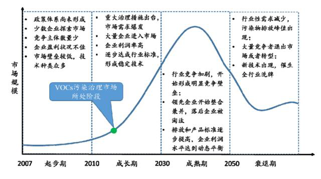 目前,我國VOCs治理市場(chǎng)處于成長(zhǎng)期的中早期階段。在這個(gè)時(shí)期,VOCs污染治理的各個(gè)細(xì)分領(lǐng)域需求快速增長(zhǎng),市場(chǎng)規(guī)模逐步擴(kuò)大,競(jìng)爭(zhēng)主體數(shù)量多但大部分經(jīng)營規(guī)模小,市場(chǎng)格局尚未成型。